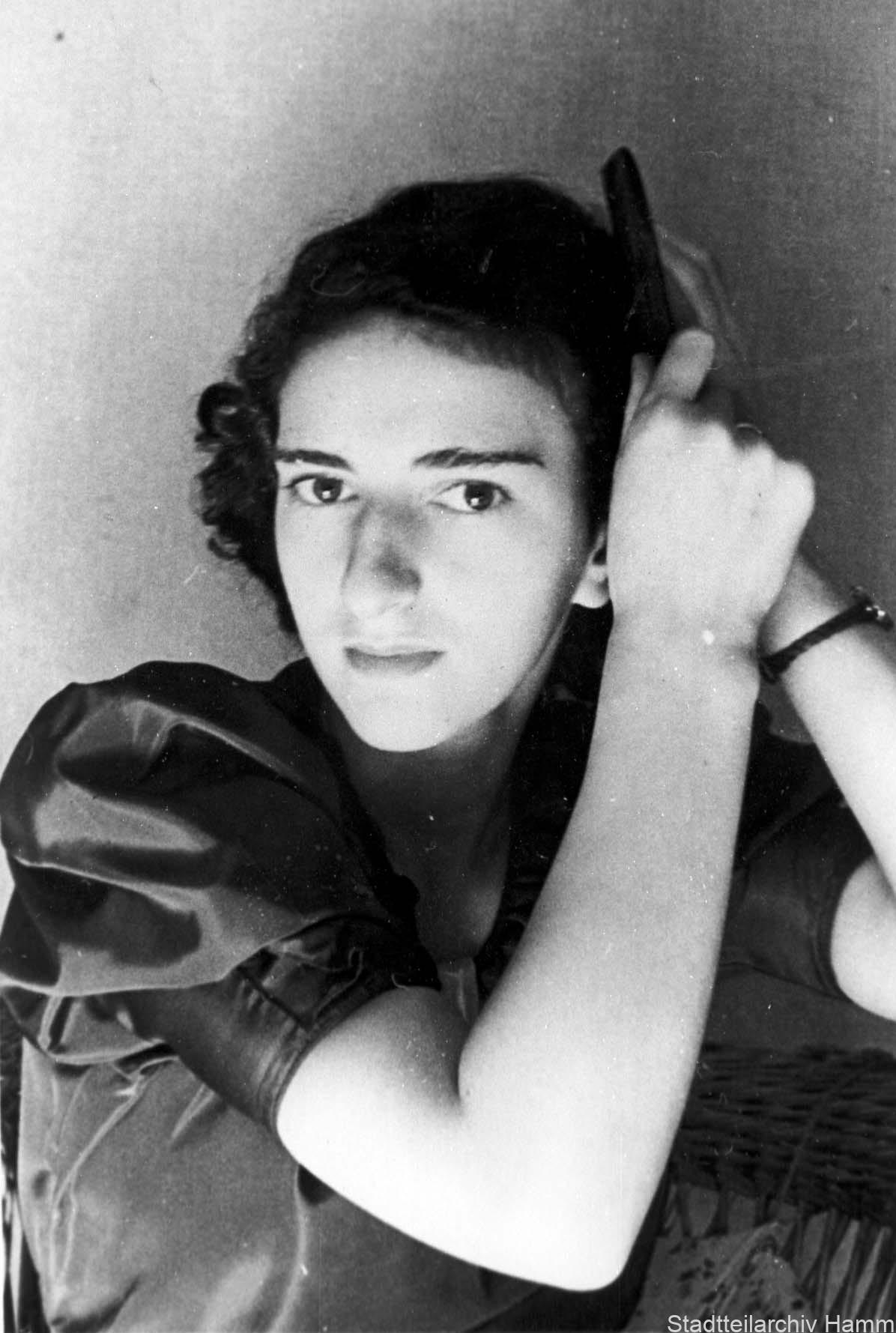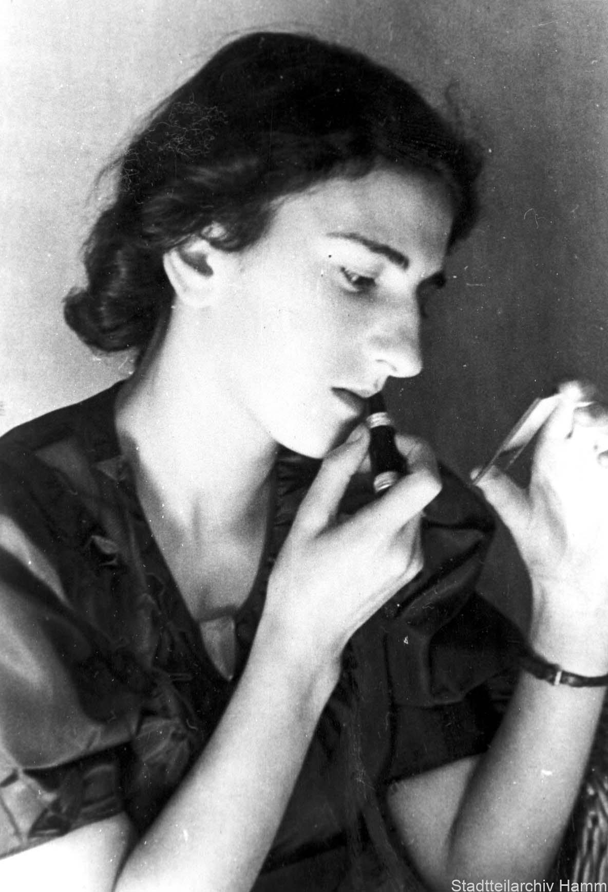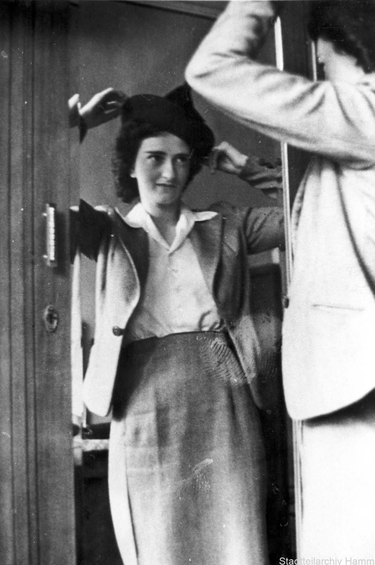 Gleich mehrere Porträtaufnahmen sind von der damals 19- bis 20-jährigen Marianne Rendsburg, geb. Rosenbaum, im Stadtteilarchiv vorhanden. Die Reihe fällt nicht allein wegen ihrem vergleichsweise umfangreichen Konvolut auf, zu dem auch noch Aufnahmen weiterer Familienmitglieder gehören. Noch ungewöhnlicher ist die Inszenierung der jungen Frau in abwechslungsreicher Kleidung mit verschiedenen Accessoires. Marianne zeigt aber auch privatere Handlungen wie das Schminken und Kämmen, die in der Regel vor dem Fotografieren ablaufen.