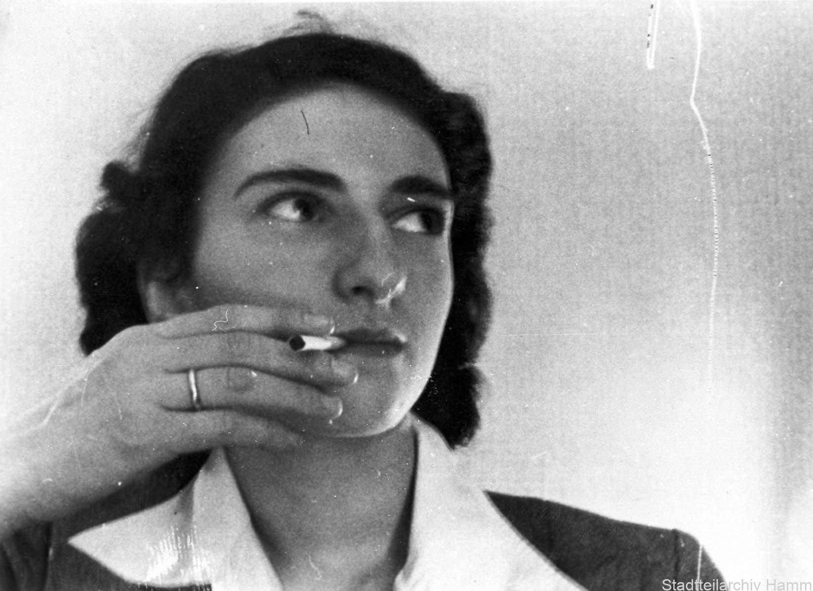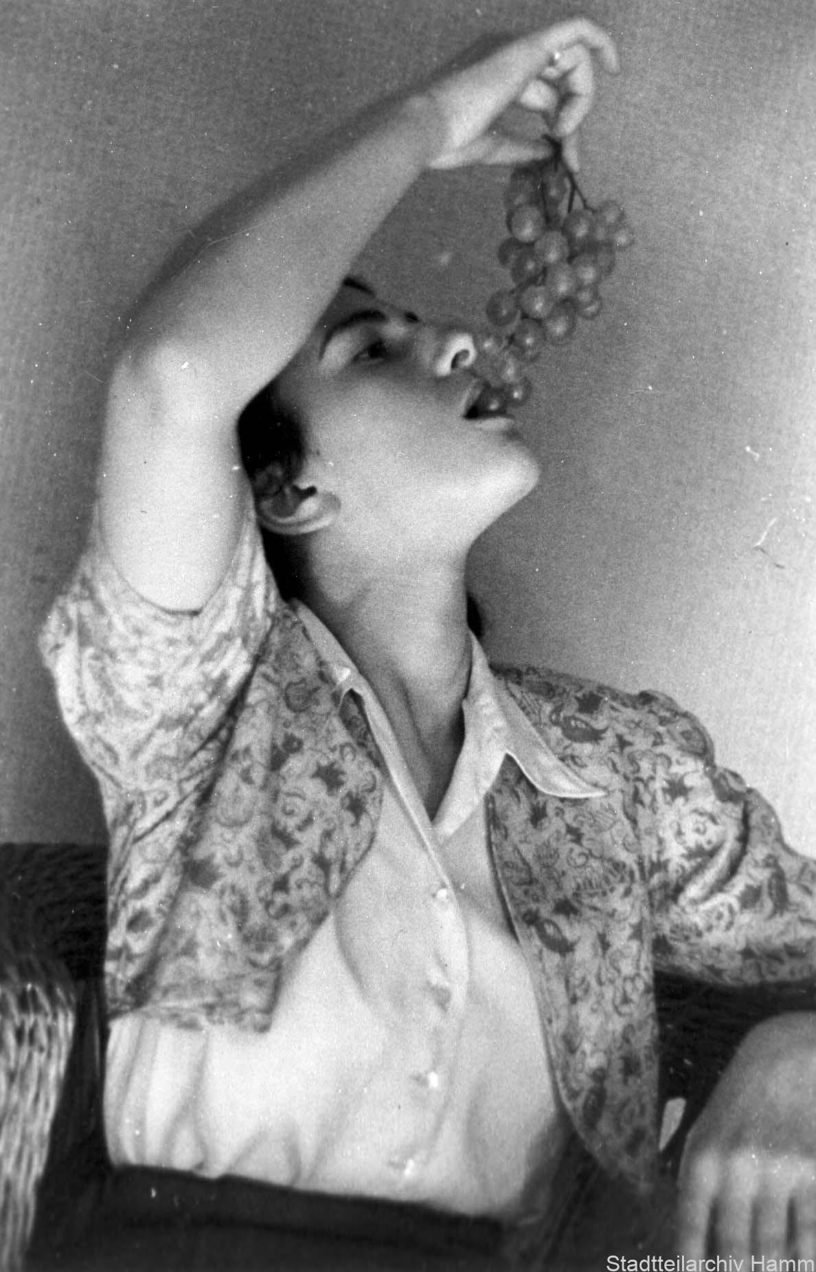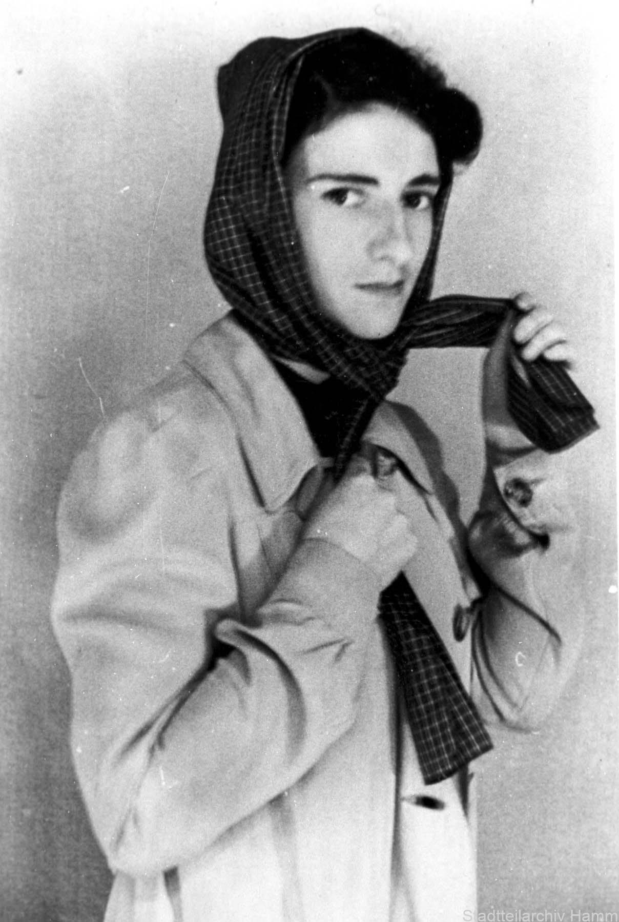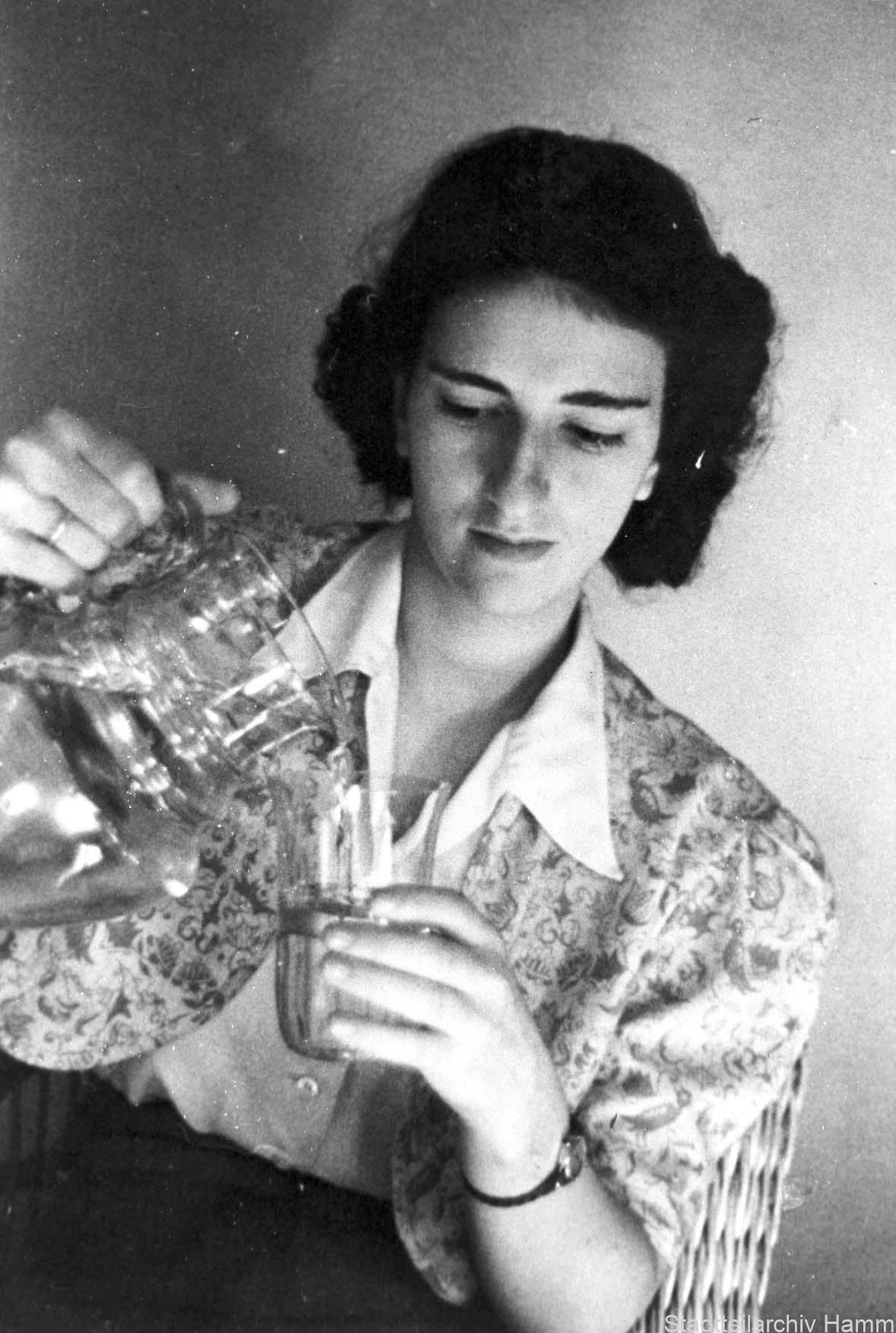 Gleich mehrere Porträtaufnahmen sind von der damals 19- bis 20-jährigen Marianne Rendsburg, geb. Rosenbaum, im Stadtteilarchiv vorhanden. Die Reihe fällt nicht allein wegen ihrem vergleichsweise umfangreichen Konvolut auf, zu dem auch noch Aufnahmen weiterer Familienmitglieder gehören. Noch ungewöhnlicher ist die Inszenierung der jungen Frau in abwechslungsreicher Kleidung mit verschiedenen Accessoires. Marianne zeigt aber auch privatere Handlungen wie das Schminken und Kämmen, die in der Regel vor dem Fotografieren ablaufen.